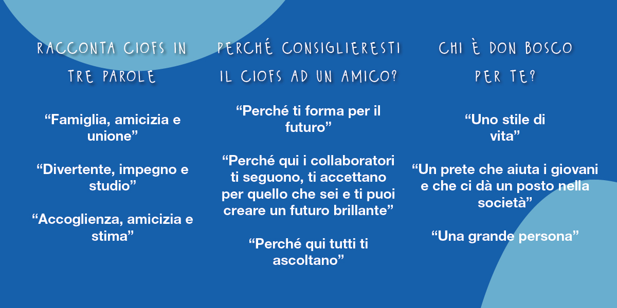 • La testimonianza dei ragazzi dei nostri Centri. È sempre motivo di stupore constatare che nonostante le distanze geografiche e nonostante i giovani intervistati non si conoscano tra di loro, nelle nostre Scuole si respiri la stessa buona aria. Ma, si sa – lo dice l’esperienza diffusa – che in una Casa di don Bosco, dovunque essa sia, ci si sente sempre a casa!